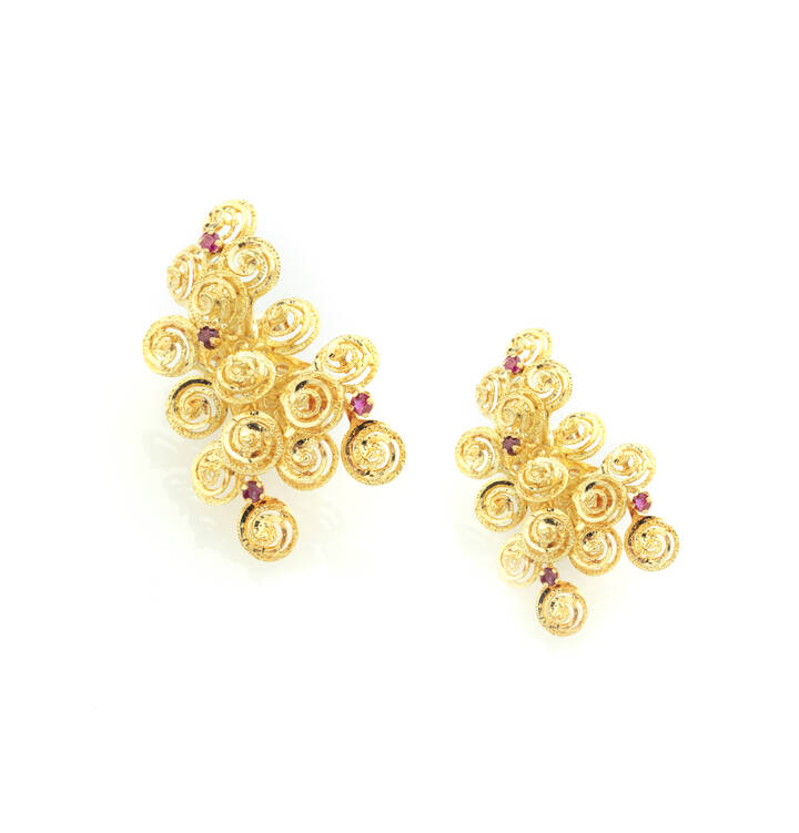 in oro giallo, composti da riccioli disposti a cascata e piccoli rubini taglio brillante