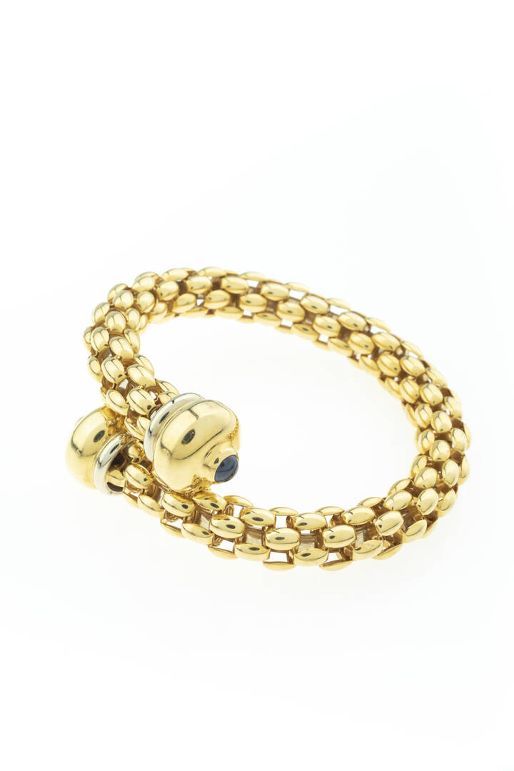 Bracciale rigido in oro giallo e bianco, lavorato a maglie bombate, firmato "Fope"; due zaffiri cabochon a decoro
