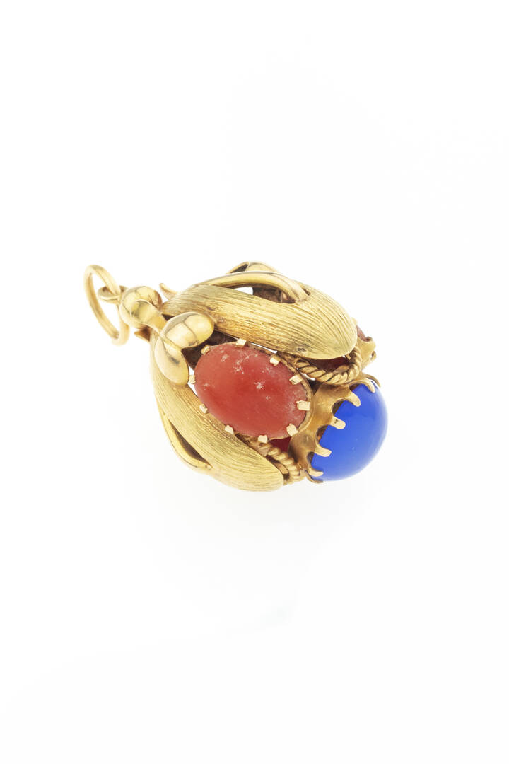 in oro giallo di forma fantasia con tre coralli mediterranei cabochon e un'agata blu taglio rotondo