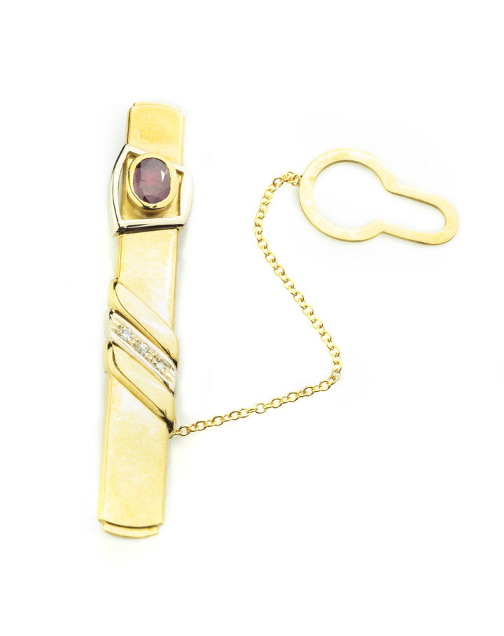 in oro giallo e bianco, a barretta, con diamanti taglio brillante per totali ct 0,03 ca ed un rubino taglio ovale di ct 0,90 ca
