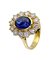 in oro giallo, sommità a margherita, zaffiro cabochon di ct 2,50 ca, contornato da diamanti taglio brillante per totali ct 1,20 ca