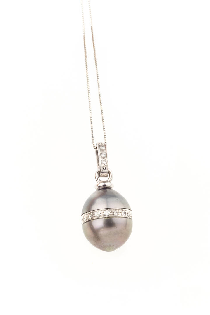 in oro bianco, con perla Tahiti ovalizzata, del diam di mm 12,5 ca; fila centrale di diamanti taglio brillante per totali ct 0,20 ca