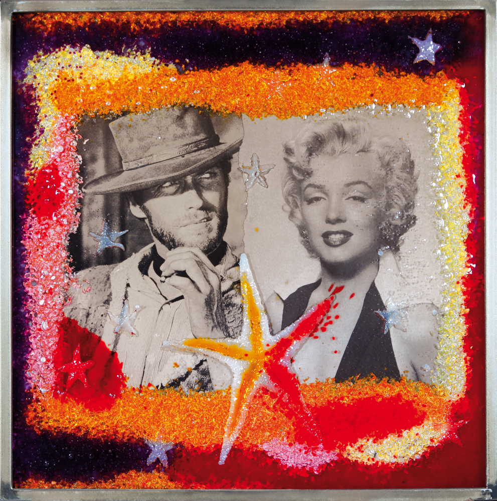 OMAR RONDA Portula (Bi) 11/09/1947 Marilyn+Clint Frozen, 2005 plastic + foto cm. 70x70, titolo, firma e anno al retro, dichiarazione d'autenticità e archivio dell'artista su foto, pubblicato su "Omar Ronda, Marilyn forever", a cura di Omar Ronda, Parise Adriano Editore Stampatore (Colognola ai Colli-VR), 2007, pagina 168.