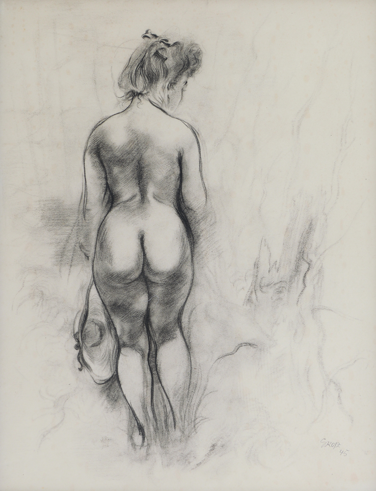 GEORGE GROSZ Berlino 26/07/1893 - Berlino 06/07/1959 Senza titolo, 1945 matita e carboncino su carta cm. 61x47, firma e anno in basso a destra, opera registrata presso l'Archivio della Fondazione Grosz come da numero e timbro al retro, dichiarazione d'autenticità a cura del Dott. Marzio Cortinovis (BO) su foto.