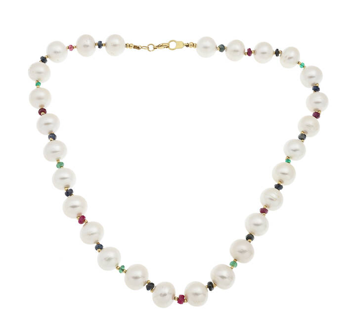 composto da un filo di perle di acqua dolce dal diam di mm 11,5 e 12, alternate da dischi in rubini, zaffiri e smeraldi sfaccettati. Chiusura in oro giallo