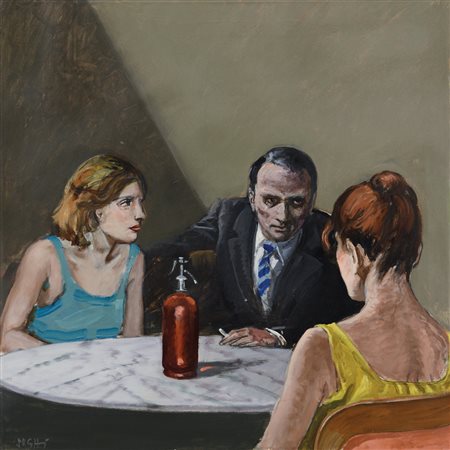 ALBERTO SUGHI Cesena (Fo) 05/10/1928 - Rimini (Rn) 31/03/2012 Figure al bar, 1974 olio su tela cm. 80x80, firma in basso a sinistra, dedica ad personam firmata dall'artista e datata 1979 al retro, dichiarazione d'autenticità dell'artista su foto, opera registrata presso l'Archivio Alberto Sughi a cura della Galleria L'Immagine (AR) come da dichiarazione su foto.
