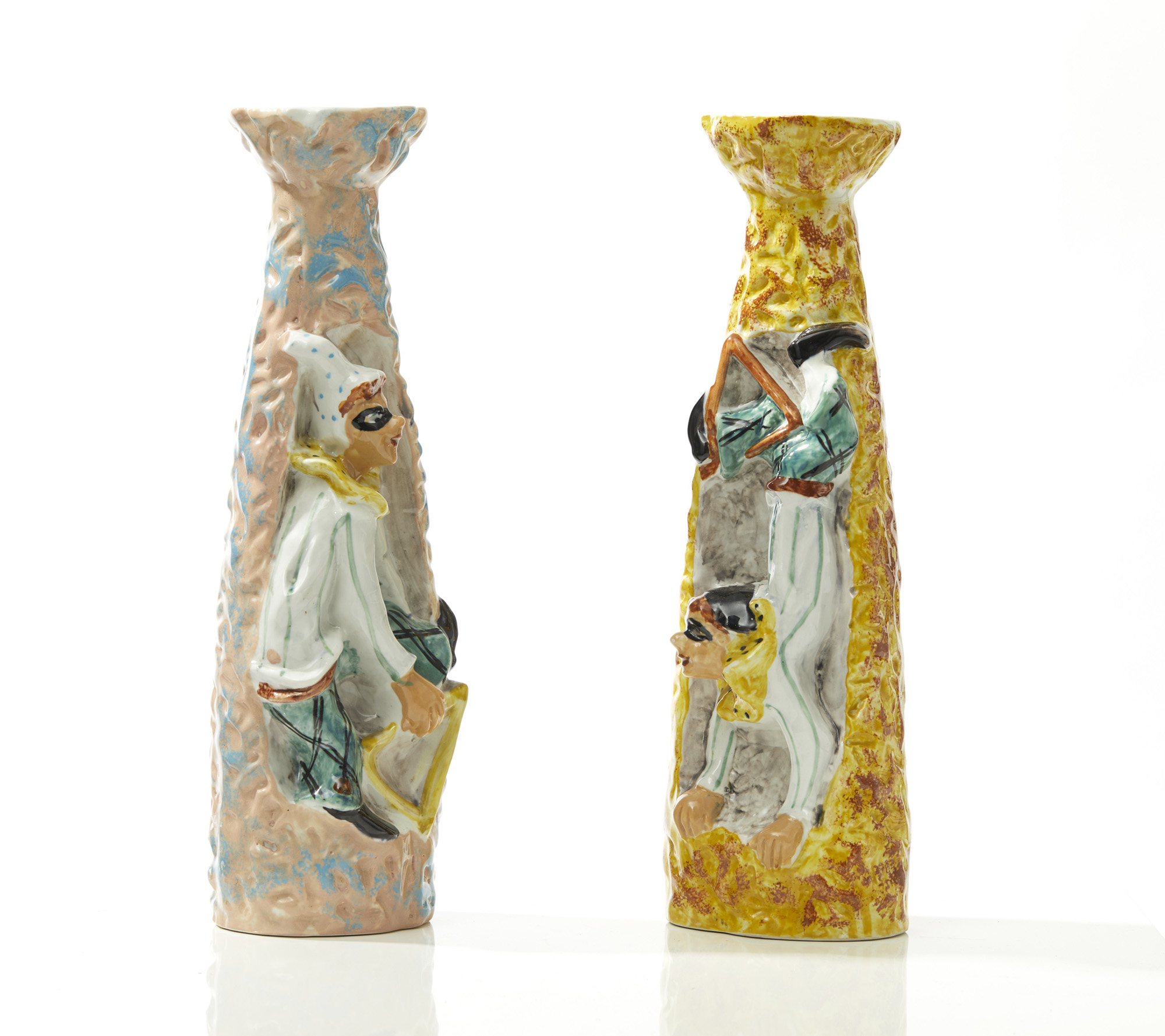 Coppia di portacandele in ceramica policroma raffigurante personaggi in maschera.