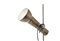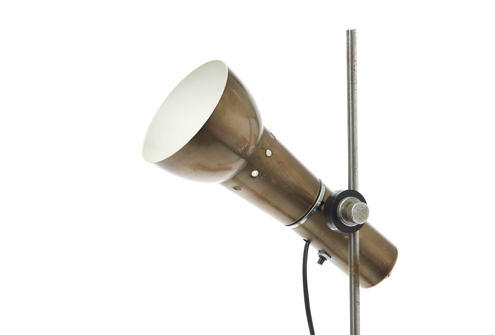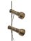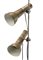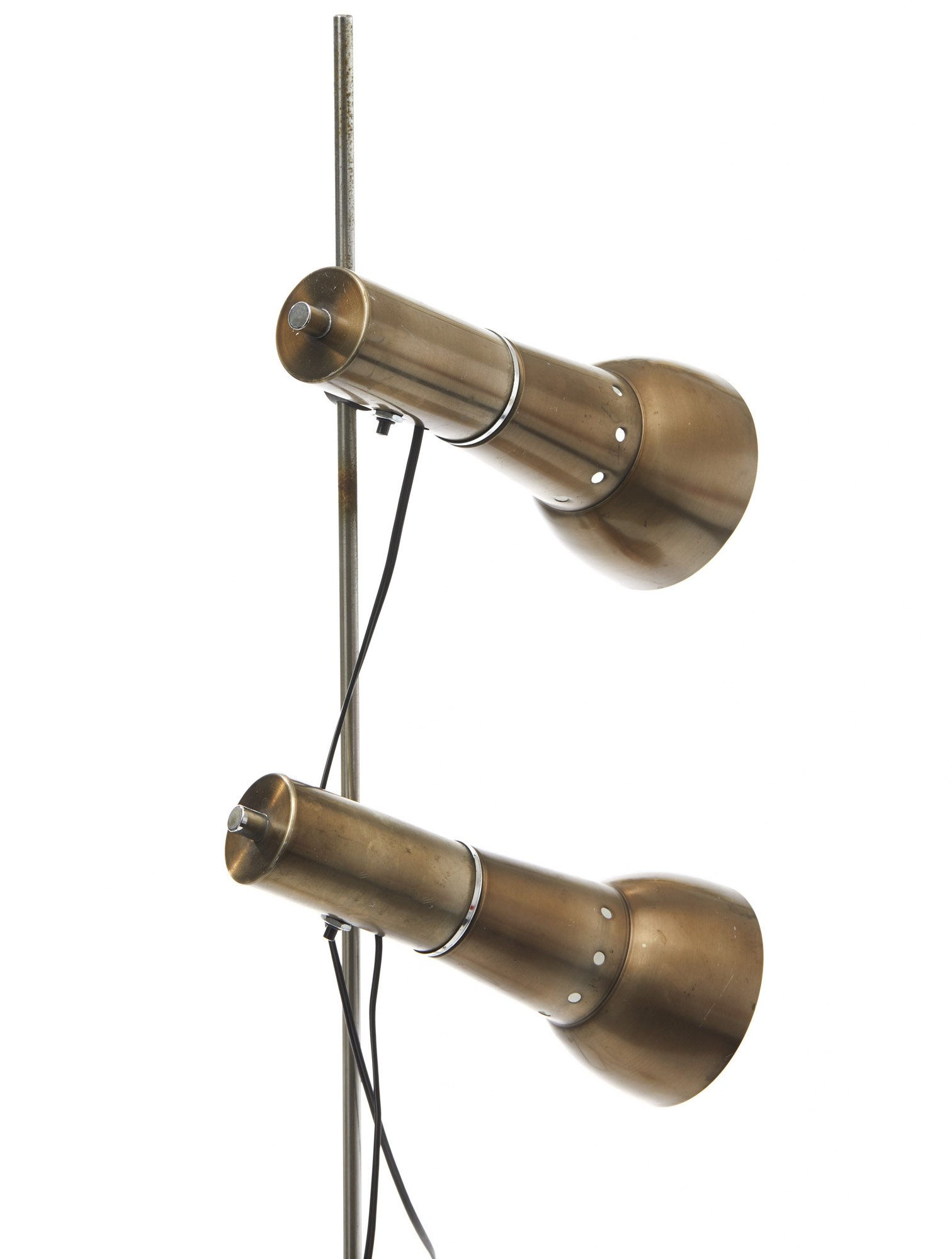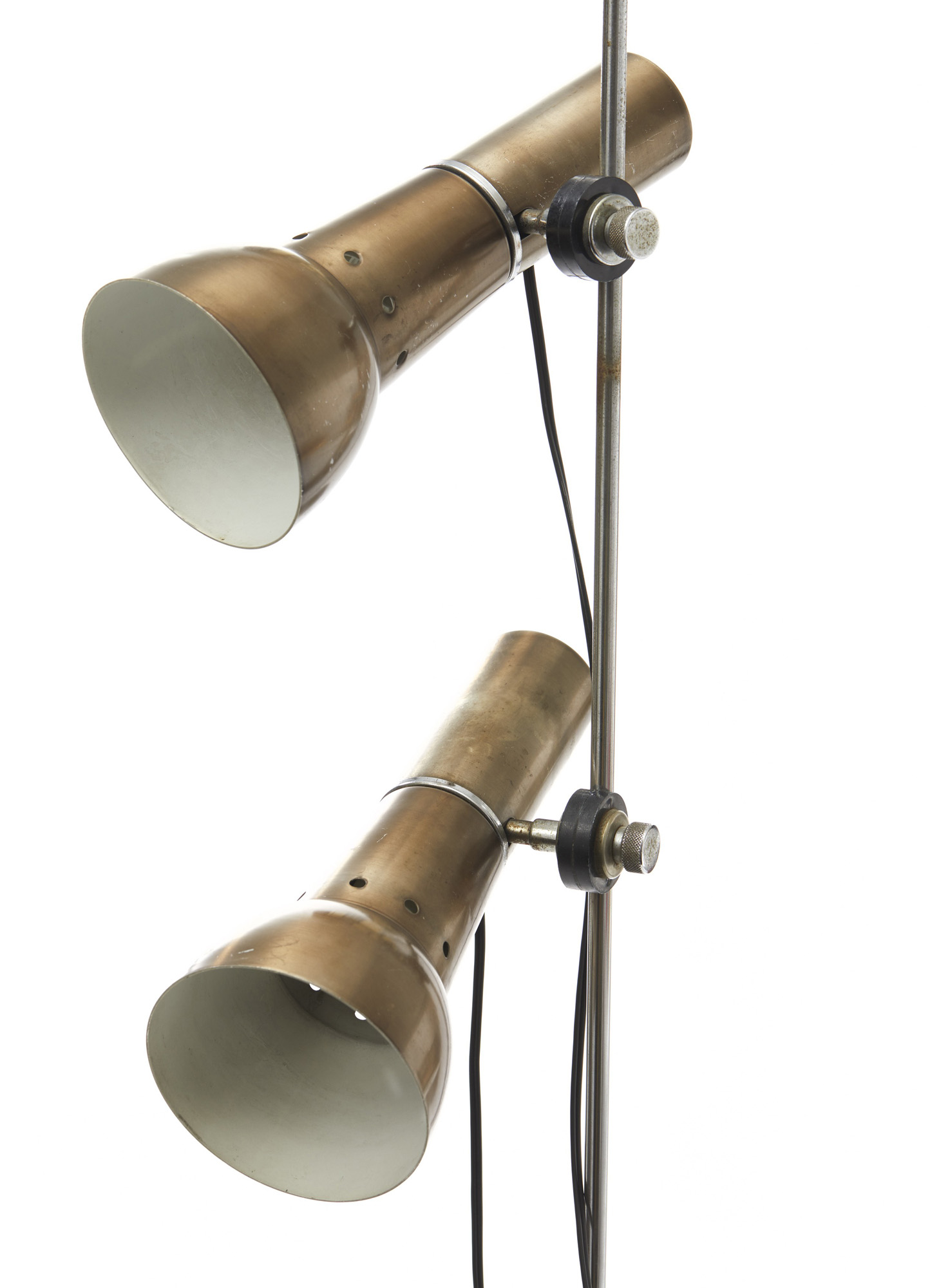 Lampada da terra con piantana in metallo cromato, base in legno, e due diffusori in metallo regolabili.