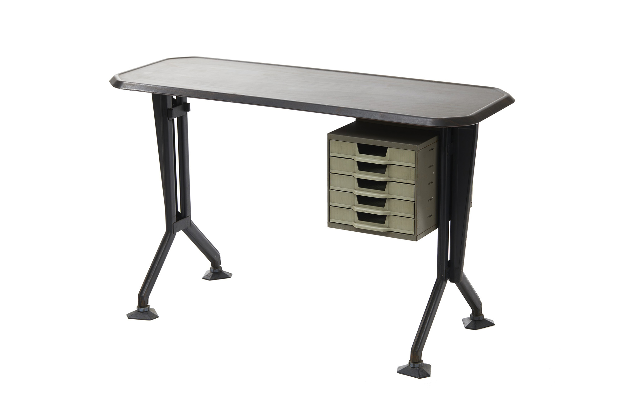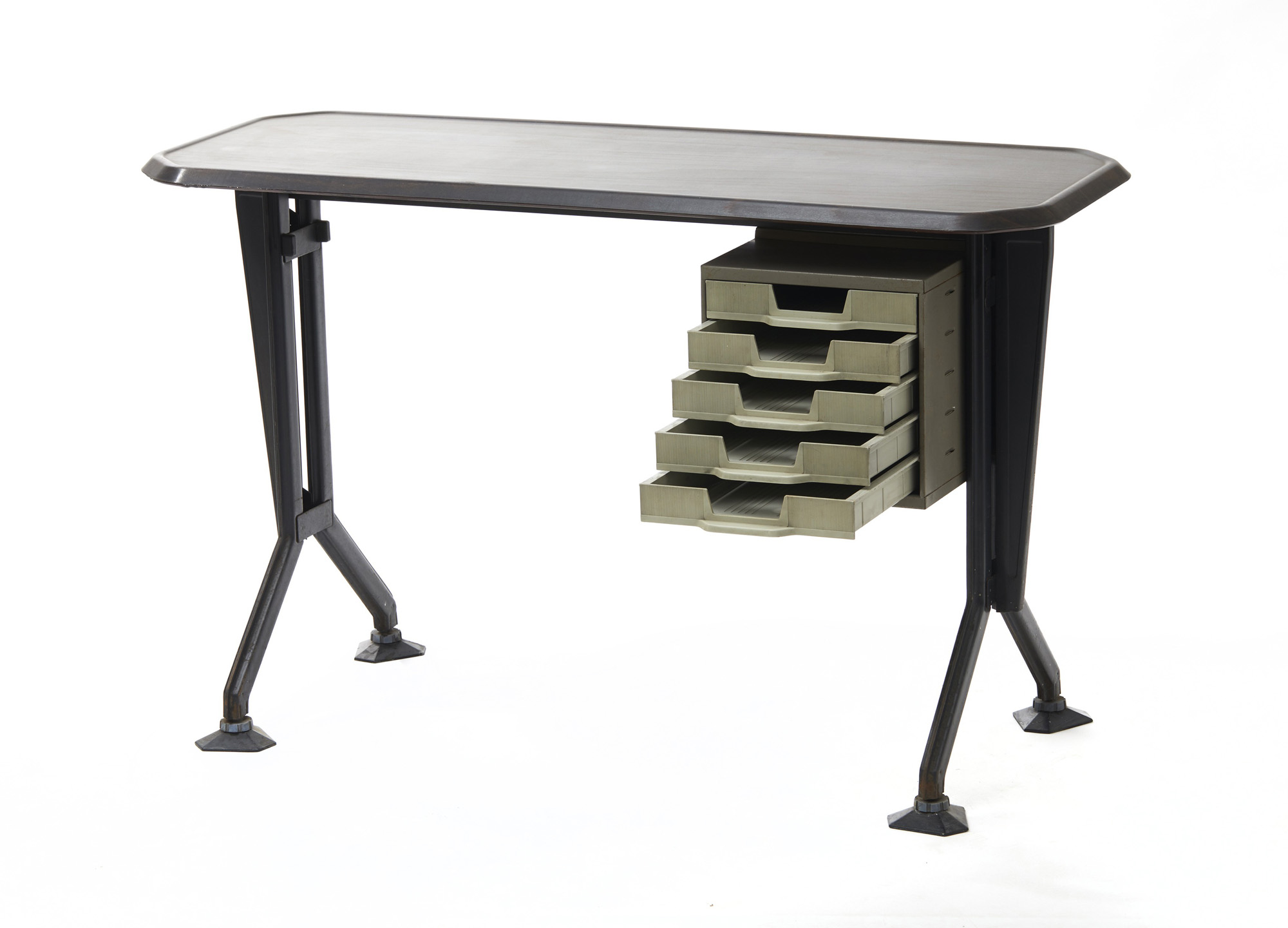 Scrivania in metallo e materiale plastico della serie "Arco" di Olivetti Synthesis, disegnata dallo studio B.B.P.R. nel 1963.