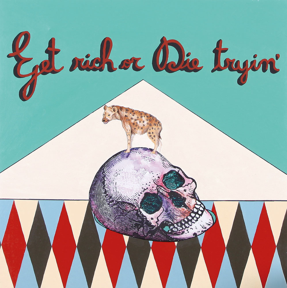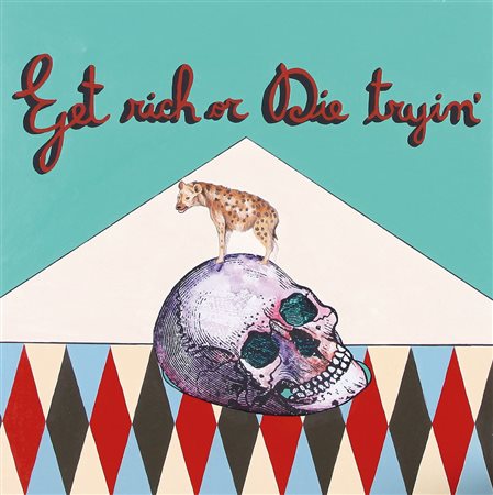 MASSIMO GURNARI Milano 01/05/1981 Get rich or die tryin', 2010 tecnica mista e collage su tela cm. 50x50, firma, titolo e anno al retro, pubblicato sul catalogo della mostra "Pensiero fluido", a cura di Alberto Mattia Martini, tenutasi dal 7 ottobre al 7 novembre 2010, presso lo Studio Oberdan (MI), pagina 91, opera priva di cornice.