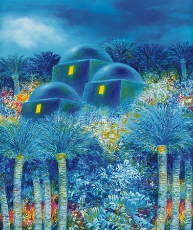 ANDREA QUARTO Lucca 1959 Luogo sacro, 2001 olio su tela cm. 60x50, firma e dedica dell'artista ad personam al retro, dichiarazione d'autenticità dell'artista e archivio Meeting Art (VC) su foto, pubblicato sul catalogo della mostra "Le magiche atmosfere di Andrea Quarto", tenutasi presso la Meeting Art (VC) nel maggio 2001, tavola 38, pagina 50.