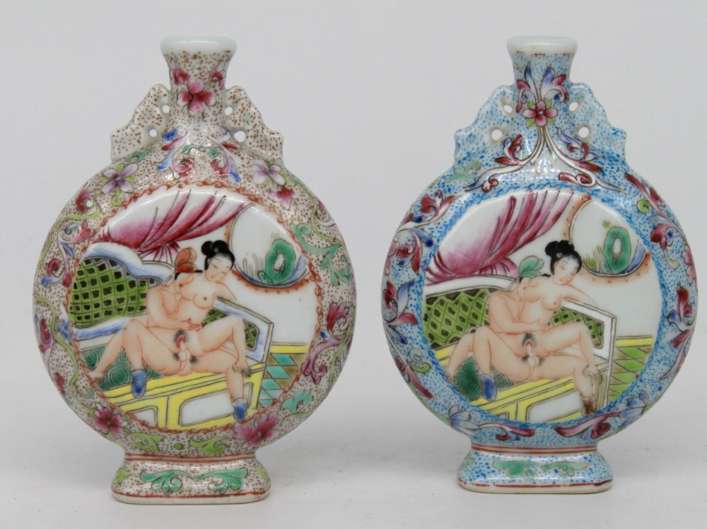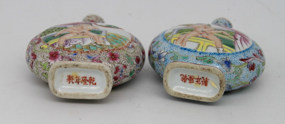 Pair of porcelain snuff bottles with polychrome enamels depicting erotic d