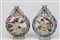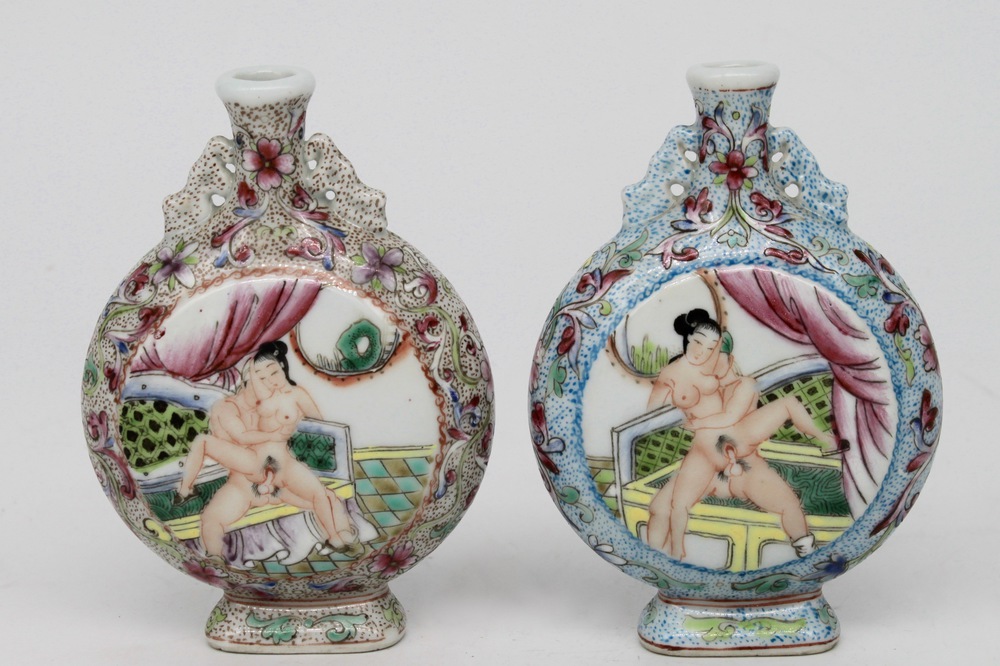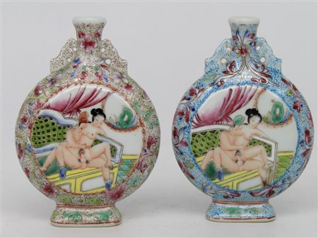 Coppia di snuff bottles in porcellana a smalti policromi raffiguranti scende erotiche