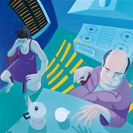STEFANO GALLI Falconara Marittima (An) 20/11/1950 Risveglio, 1997 acrilico su tela cm. 80x80, firma in basso a sinistra, titolo, firma e anno al retro, dichiarazione d'autenticità dell'artista e archivio Meeting Art (VC) su foto, pubblicato sul catalogo della mostra personale tenutasi presso la Meeting Art nel settembre 2000 al numero 56, pagina 33.