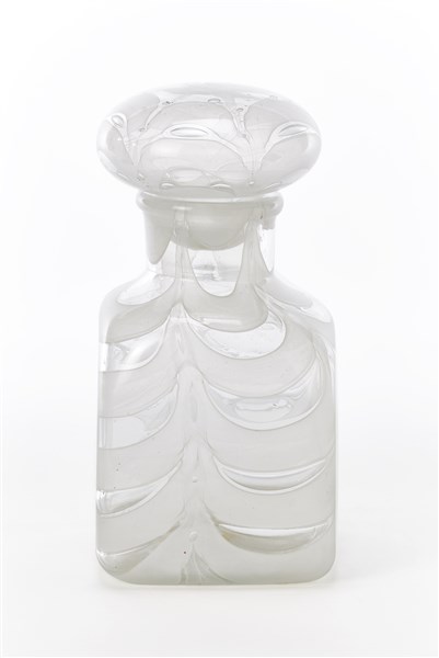 Bottiglia a sezione quadrangolare con tappo della serie "Graffito diafano". Barovier & Toso, Murano, anni '60. Vetro trasparente incolore e acidato. Firmata sotto la base. (h tot cm 30,5)