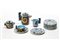 Part of a futuristic ceramic set, glazed in polychrome and in shades of blue with the airbrush, composed of a teapot, eight cups, eight saucers, a sugar bowl, a milk jug. G.M.A, Albisola, 1950s. Signed under the base. (defects)