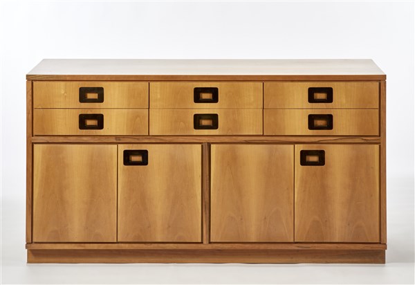 Cassettone a due livelli con sei cassetti nella fascia superiore e due vani a doppia anta nella fascia inferiore. Esecuzione Brugnoli Mobili, Cantù, 1960. Legno di noce naturale impiallacciato e bordato con maniglie di tipo "navale" in ottone forgiato lavorato a mano. (cm 150x80x50) (lievi difetti)