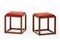 Pair of stools. Execution by Poggi, Pavia, 1950s. Solid teak wood, seat covered in red fabric. Rare specimen limited editions. (38x40x38 cm.) (slight defects)