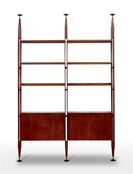 Libreria a due moduli con due stipi a due ante, due vassoi e quattro ripiani modello "LB7". Esecuzione Poggi, Pavia, 1956. Legno massello, impiallacciato e bordato di teak. (cm 175x252(montanti lignei)x35) (lievi difetti e piccoli restauri)