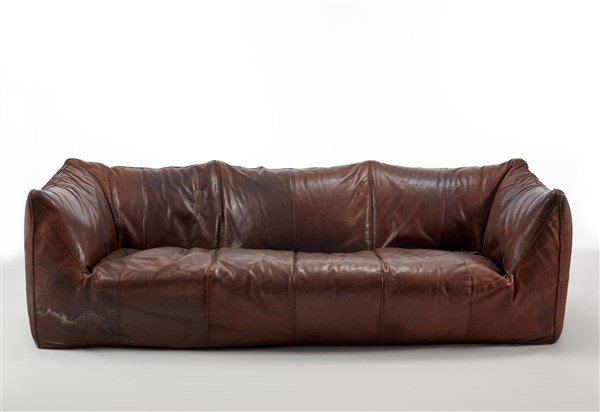 Divano a tre posti della serie "Le Bambole". Produzione B&B, Italia, 1972. Rivestimento in pelle marrone. Premio "Compasso d'oro", 1979. (cm 250x72x90) (difetti)