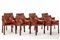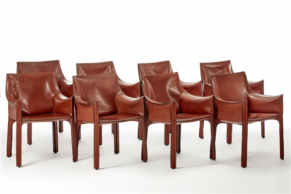 Otto poltroncine con braccioli modello "Cab 413". Produzione Cassina, Meda, disegno del 1979, esemplari del 1980. Struttura metallica, rivestimento in cuoio marrone. Alcuni esemplari recanti etichetta cartacea del produttore sotto la seduta. (cm 58x81x52) (difetti)