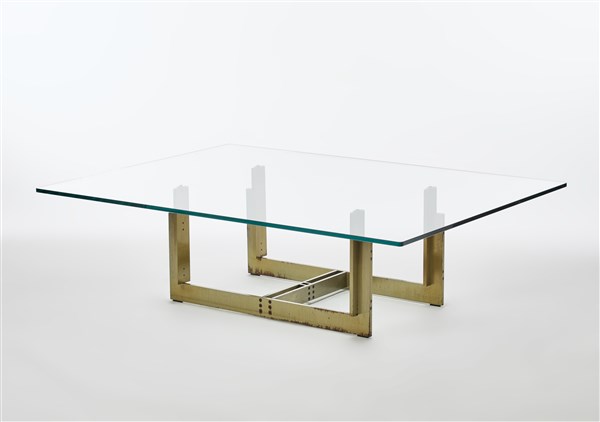Tavolino modello "Florian". Produzione Simon, Bologna, anni '70. Base in acciaio satinato e piano in cristallo. Recante etichetta del produttore sulla base. (cm 154x44x113,5) (lievi difetti)