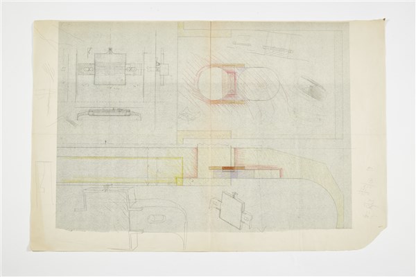 Study for the plaque affixed to the facade of the Querini Stampalia Foundation. Venice, 1959-63. Graphite and colored pencils on a heliographic copy of the technical drawing. Orthogonal projections, section and detail with indication of the materials, freehand axonometry of the entire objec. (49.5x74.5 cm.) (slight defects)