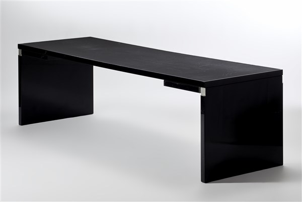 Table model "Orseolo". Produced by Simon Gavina, San Lazzaro, 1972 drawing, 1984 specimenBlack lacquered plywood, joints in satin aluminum casting. (241.5x71.5x77 cm.) (defects)