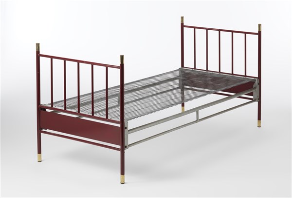 Letto singolo modello "Francesco Giuseppe". Produzione Azucena, Milano, 1958. Ferro verniciato bordeaux, puntali e terminali in ottone. (cm 88x94x194,5) (lievi difetti)