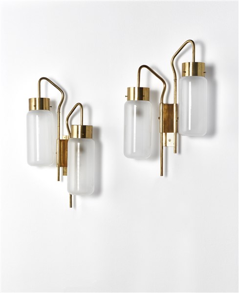 Coppia di lampade da parete a due luci modello "Bidone". Produzione Azucena, Milano, anni '50. Ottone e vetro smerigliato bianco. (h cm 54) (lievi difetti e mancanza di due portalampadine)