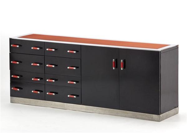 Mobile contenitore su misura a cassetti e ante della serie "Fasce cromate". Milano, anni '50. Legno verniciato nero, maniglie in metallo cromato e resina rossa, base rivestita in lamina di alluminio, piano rivestito in panno rosso con bordo in acciaio cromato. (cm 190x74,5x45) (difetti)