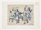 Disegno raffigurante un gruppo di cuochi all'interno delle cucine di Palazzo Labia a Venezia. La scena ritrae probabilmente un momento del celebre ballo di Charles de Beistegui. Venezia, 1951. Inchiostro celeste e pastello nero su carta. Firmato, locato e datato in basso a destra. (cm 17x22) (lievi difetti)