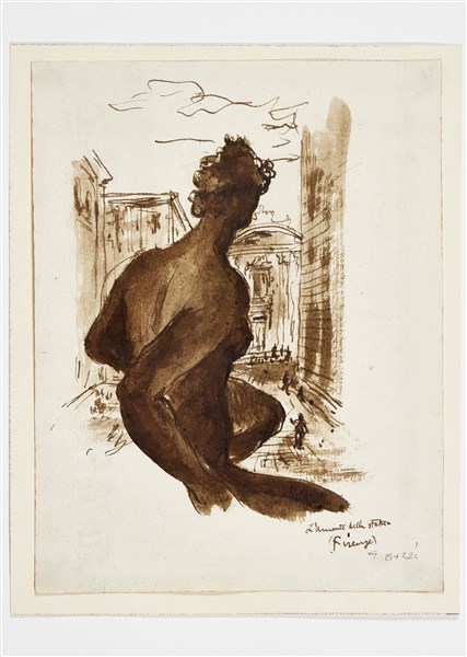 Drawing with a male figure portrayed from three quarters from behind, urban background of the San Firenze. Florence, s.d. (anni '40 '50). Brown ink watercolored on paper fixed on cardboard. Titled and leased. Signed in pen on the bottom right. (27.9x21.4 cm.) (slight defects)