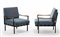Coppia di poltrone modello "P24". Produzione Tecno, Varedo, 1961. Struttura in metallo verniciato grigio scuro, cuscini imbottiti asportabili rivestiti in tessuto blu-verde, braccioli in legno. (cm 75x82x77) (lievi difetti)