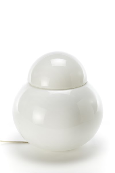 Lampada da tavolo composta da due calotte sferiche di diverso diametro modello "Daruma". Produzione Candle, Italia, 1966. Vetro lattimo. (h cm 36)