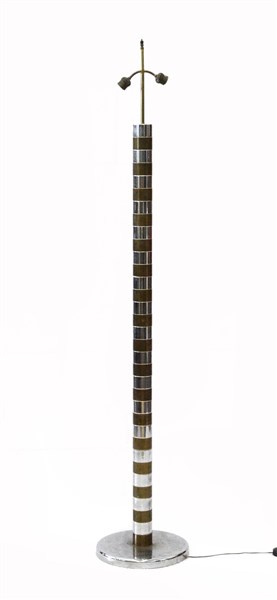 Lampada da terra a due luci con fusto bicolore in ottone cromato e lucidato. Italia, anni '70. (h cm 165) (lievi difetti)