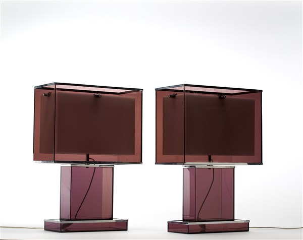 Coppia di lampade da tavolo in plexiglass ametista opalino e ottone cromato. It