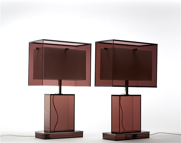 Coppia di lampade da tavolo in plexiglass ametista opalino e ottone cromato. It