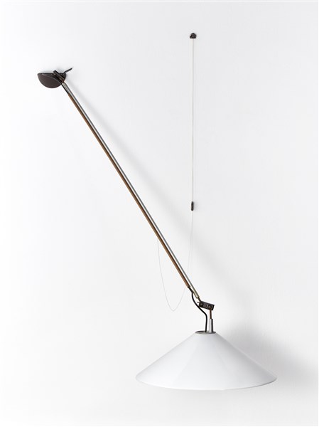 Lampada da parete a braccio orientabile della serie "Aggregato". Produzione Artemide, Milano, 1976. Attacco in resina termoplastica e metallo verniciati, stelo in alluminio, blocco a serraggio in metallo verniciato, diffusore in metacrilato. (l cm 115) (lievi difetti)