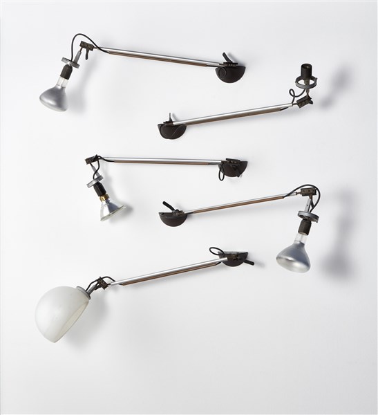 Gruppo di cinque lampade da parete a braccio orientabile della serie "Aggregato". Produzione Artemide, Milano, 1976. Attacco in resina termoplastica e metallo verniciati, stelo in alluminio, blocco a serraggio in metallo verniciato. Solo un elemento dotato di diffusore in metacrilato. (l cm 56) (lievi difetti)