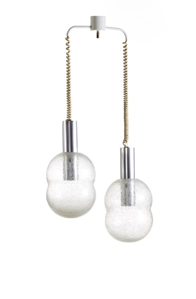 Lampada da sospensione a due luci modello "Bilobo". Produzione Flos, Italia, 1963. Struttura in metallo verniciato bianco, alluminio, diffusore in vetro soffiato con inclusione di bolle. (h cm 97) (lievi difetti)