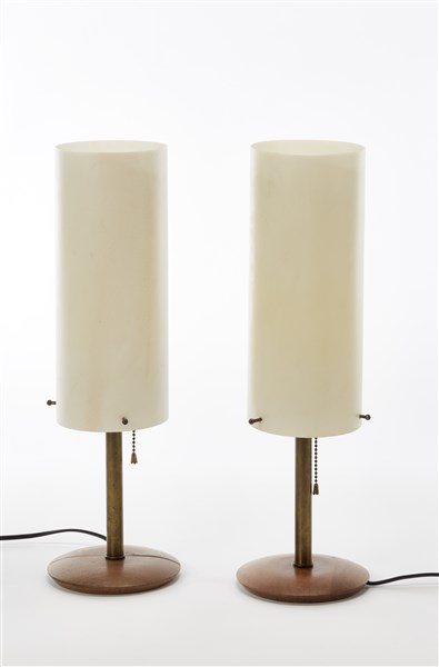 Coppia di lampade da tavolo con base in legno, fusto in ottone e paralumi in metacrilato opalino. Italia, anni '60/'70. (h cm 48; d cm 12,5) (lievi difetti)