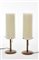 Coppia di lampade da tavolo con base in legno, fusto in ottone e paralumi in me