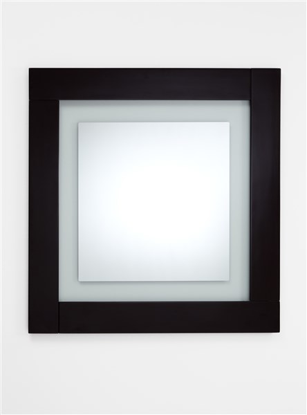 Specchio modello "Specchio Laccato". Produzione Azucena, Milano, 1976. Cornice in legno laccato marrone scuro a rincorrersi con fascia trasparente tra legno e specchio. (cm 100x100)