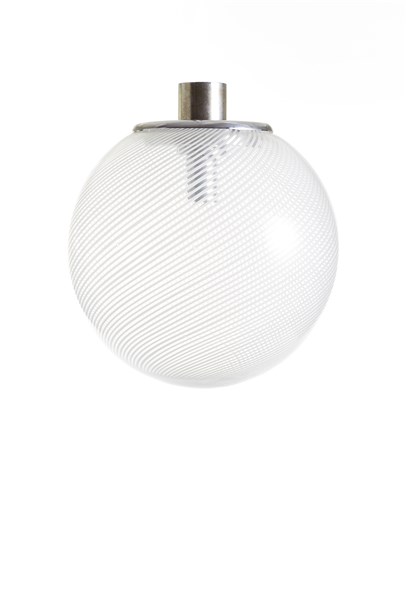 Lampada a sospensione con diffusore globulare in vetro a mezza filigrana e attacco in metallo cromato. Anni '70. (d cm 38)