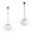 Coppia di lampade a sospensione con diffusore di forma schiacciata in vetro incamiciato lattimo, struttura in ottone. Italia, anni '50. (h cm 95) (lievi difetti)