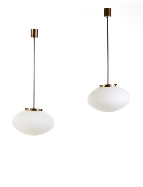 Coppia di lampade a sospensione con diffusore di forma schiacciata in vetro incamiciato lattimo, struttura in ottone. Italia, anni '50. (h cm 95) (lievi difetti)