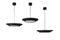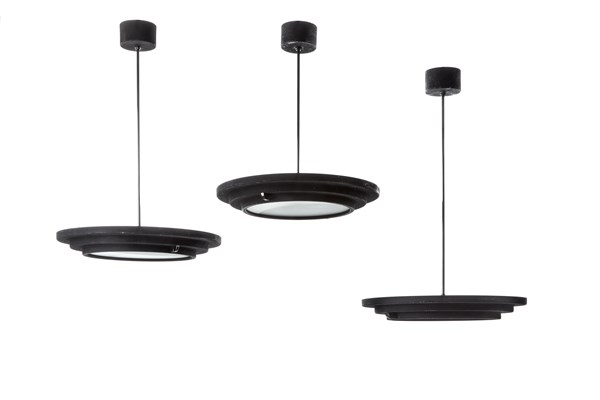 Three two-light pendant lamps. Italy, 1970s. Connection and diffuser disc in corrugated black and white painted aluminum, structure in chromed metal, etched glass on one side. Bearing adhesive label. (h 110 cm.; d 55 cm.) (slight defects)