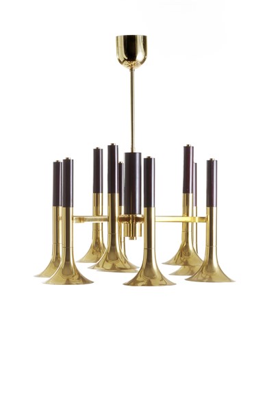 Lampada a sospensione a nove luci a “tromba”. Italia, anni '70. Ottone e legno verniciato. (h cm 90) (lievi difetti)