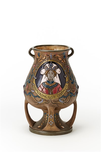 Biansato vase in opaque polycrome under glazed ceramic, with reliefs and vegetal graffiti in Art Nouveau taste, rounds inscribed and decorated with a black rooster and a crowned female half-length portrait. Imperial Amphora Turn, Austria, early 20th century. Marked under the base. (h 30 cm.) (slight defects)